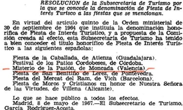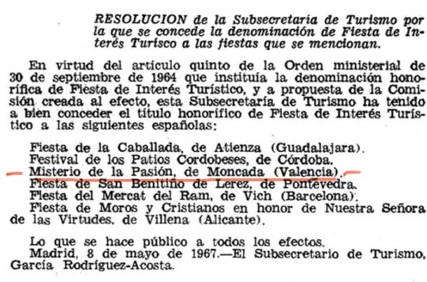 Fruto del buen hacer y del entusiasmo mostrado durante estos años el Ministerio de Información y Turismo, el 8 de mayo de 1967, declaró nuestras representaciones “Fiesta de Interés Turístico” publicándose en el BOE el 16 de junio de ese año.